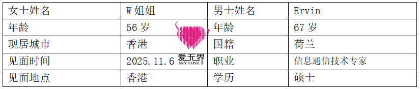 56岁的香港W姐姐,在跨国交友平台上又收获了一份特别的缘分——来自荷兰的Ervin,为她专程飞赴香港见面!