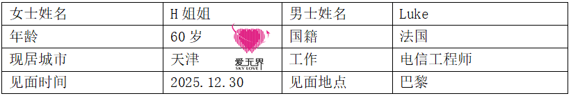 H姐姐,60岁,来自天津。Luke,法国人,电信工程师出身,现在经营自己的事业。2025年12月30日,他们在巴黎迎来了第一次见面!
