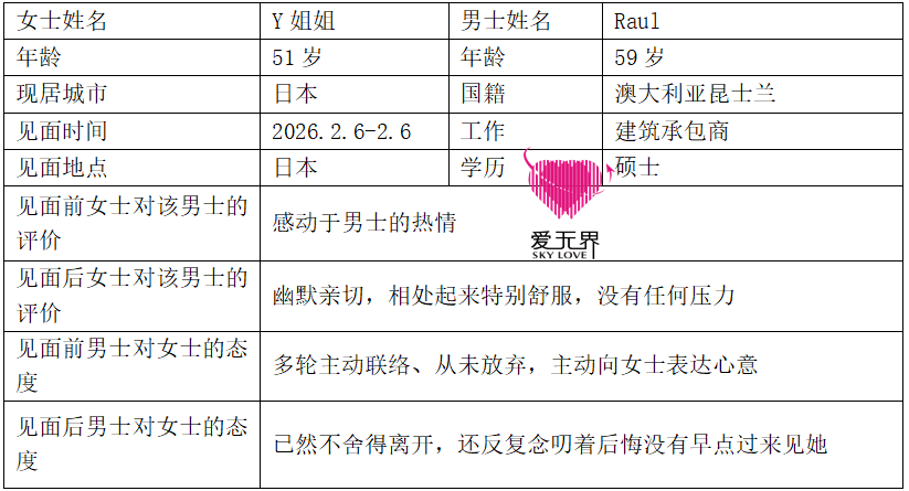 Y姐姐51岁,在日本生活。Raul比她大八岁,定居在澳大利亚昆士兰,硕士学历,是一名建筑承包商,经济稳定、时间自由。他性格开朗且富有冒险精神,爱旅行、爱滑雪!